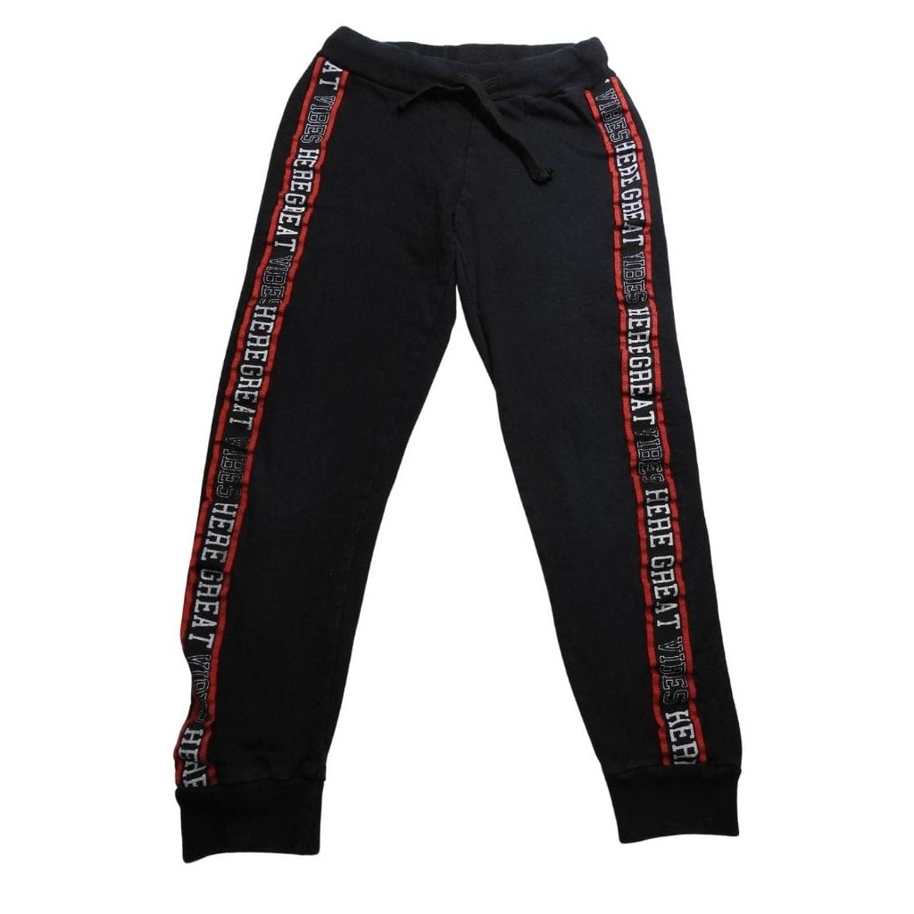 Fekete melegítőnadrág/jogger az oldalán végigfutó trendi piros-fehér "Vibes" feliratos sávval díszítve.