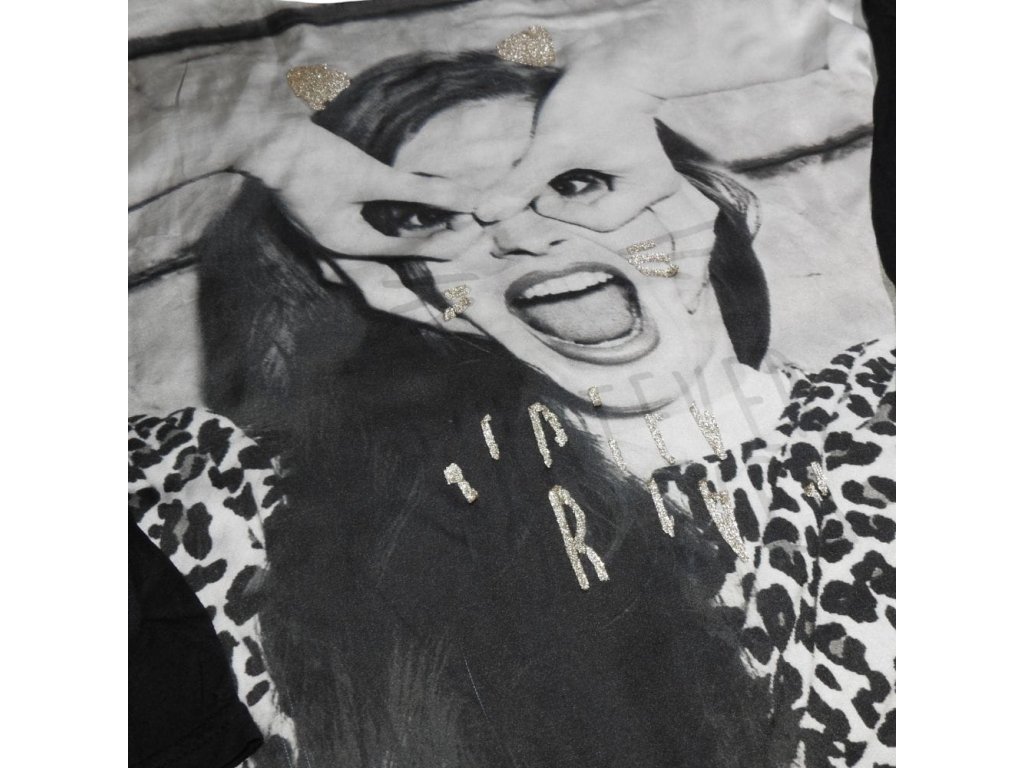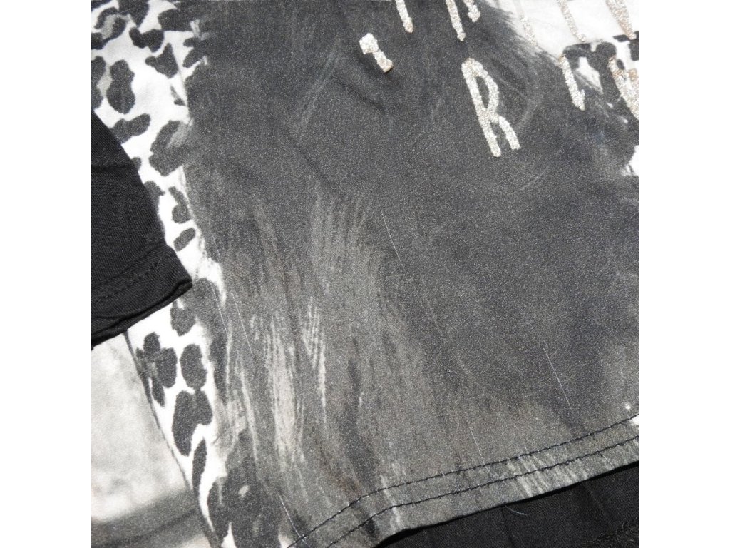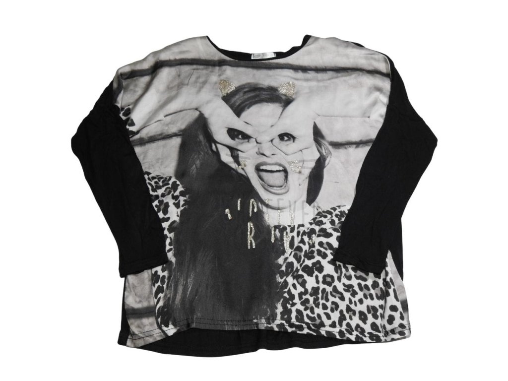 Fekete, hosszú ujjú, laza szabású, selymes anyagú felső női mintával.