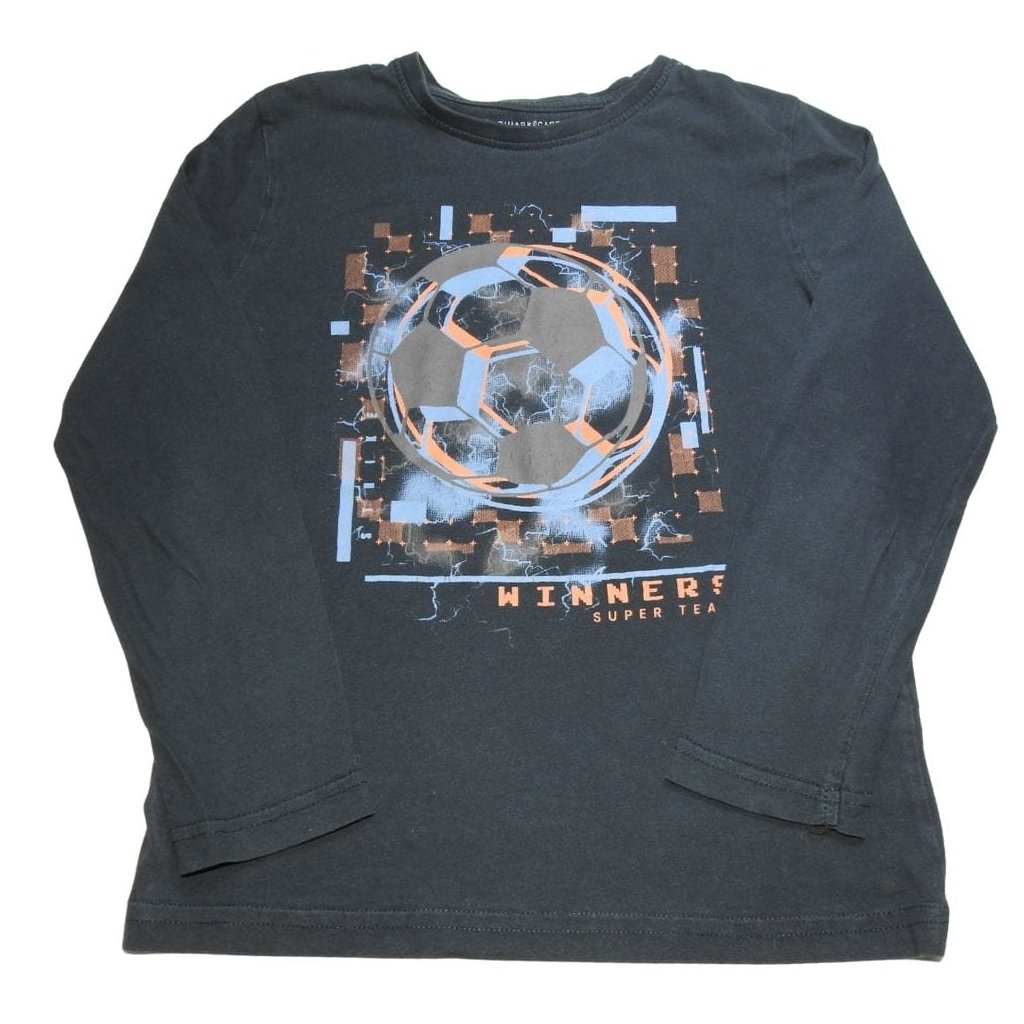 Sötétkék, hosszú ujjú póló focilabdás mintával.