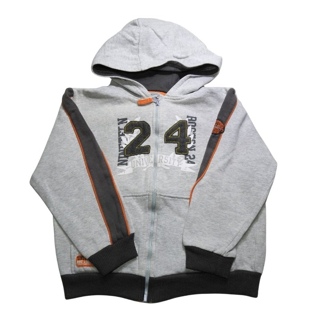 Világosszürke, kapucnis pulóver cipzáras záródással, hímzett és nyomott mintával.