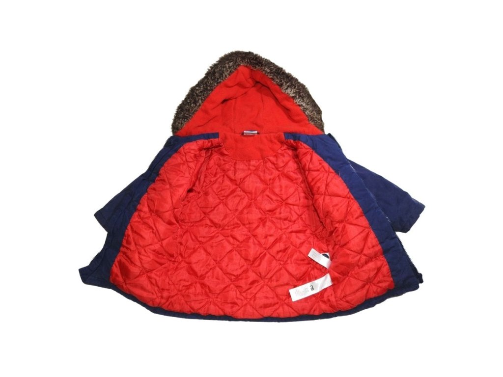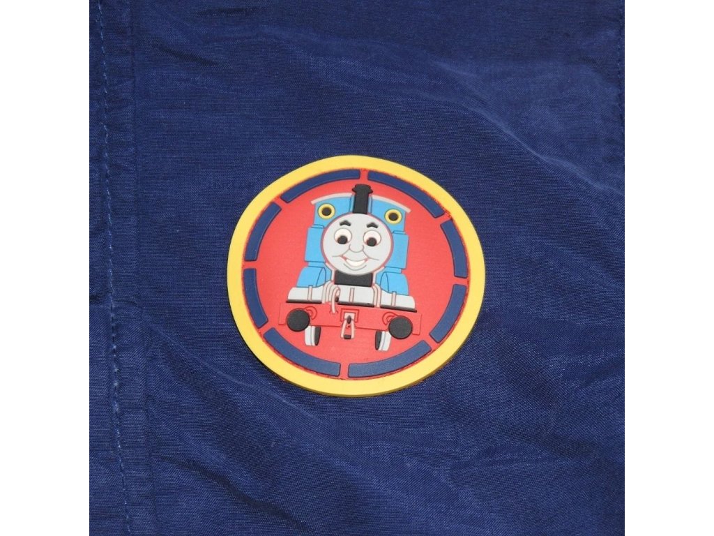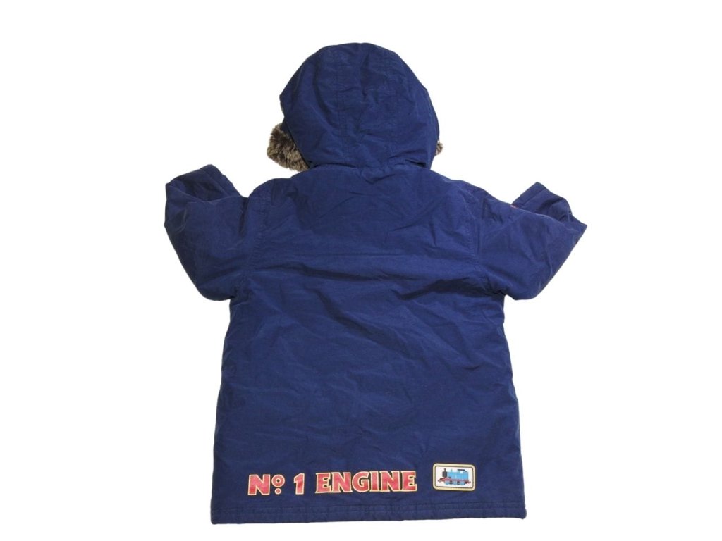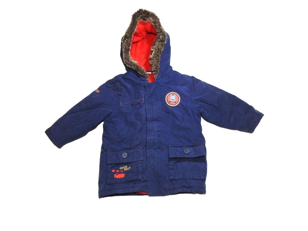 Kék téli kabát, piros belsővel, szőrmés kapucnival, Thomas a gőzmozdony mintával.