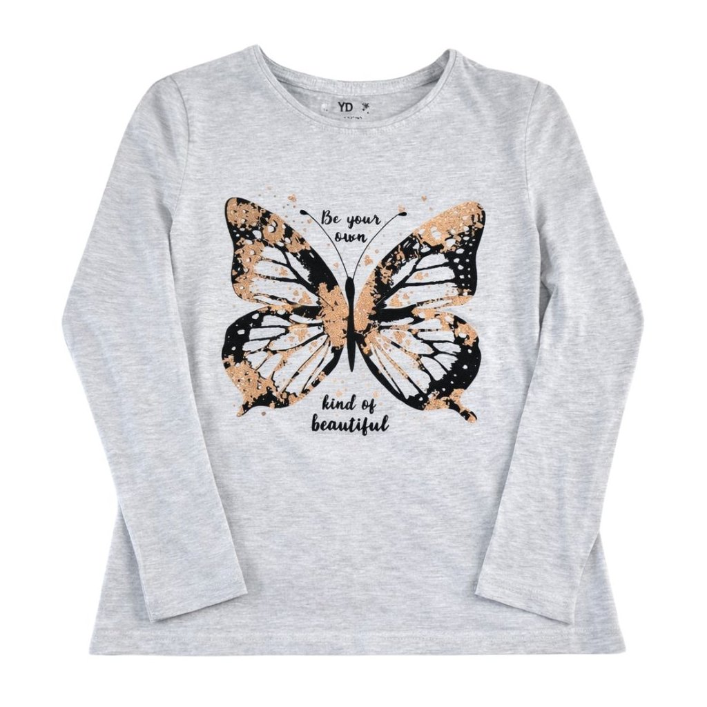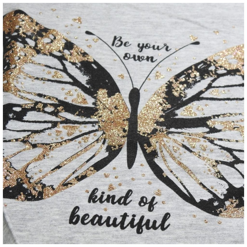 Szürke, hosszú ujjú felső fekete, arany színű csillámos pillangó mintával.