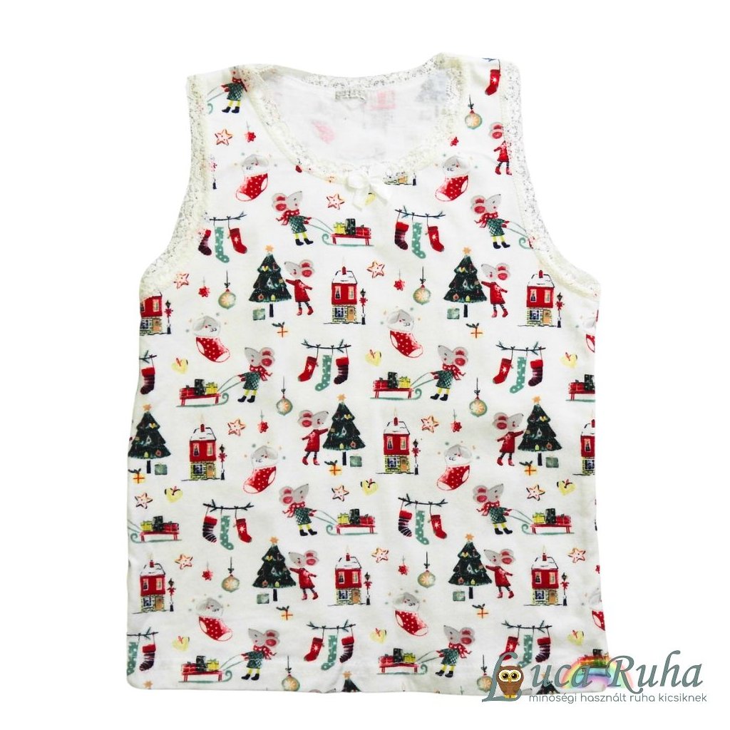 Fehér, csipkés trikó, színes karácsonyi mintával. Mérete becsült a centis adatok alapján.